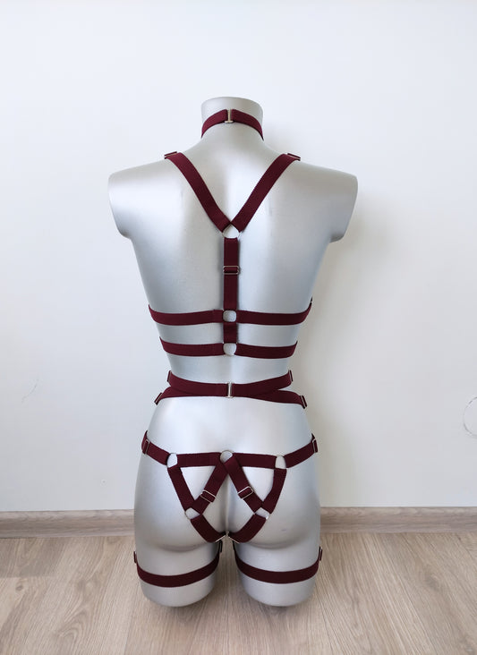 Baldur - burgundy women harness lingerie set with garter belt