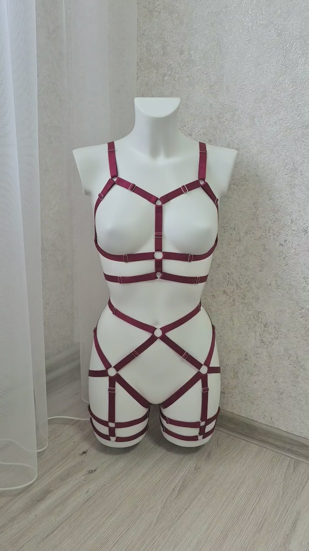 Harness lingerie made from elastic burgundy trim and silver hardwear. Match it with your favourite lingerie set to create special seductive look.