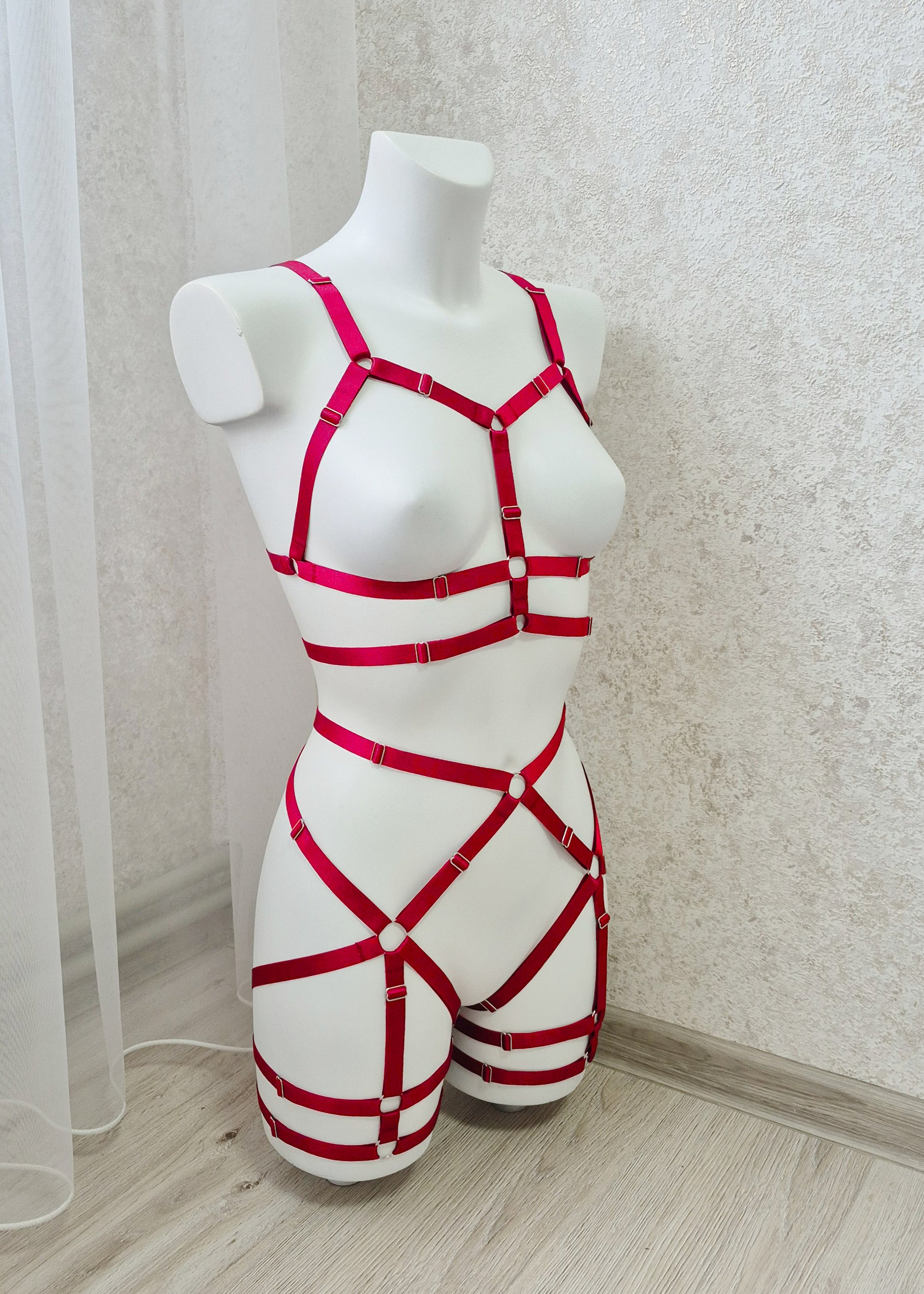 Harness lingerie made from elastic red trim and silver hardwear. Match it with your favourite lingerie set to create special seductive look.