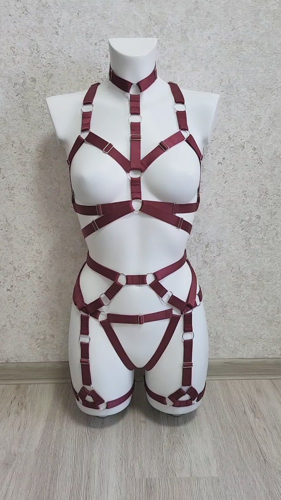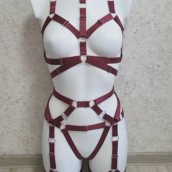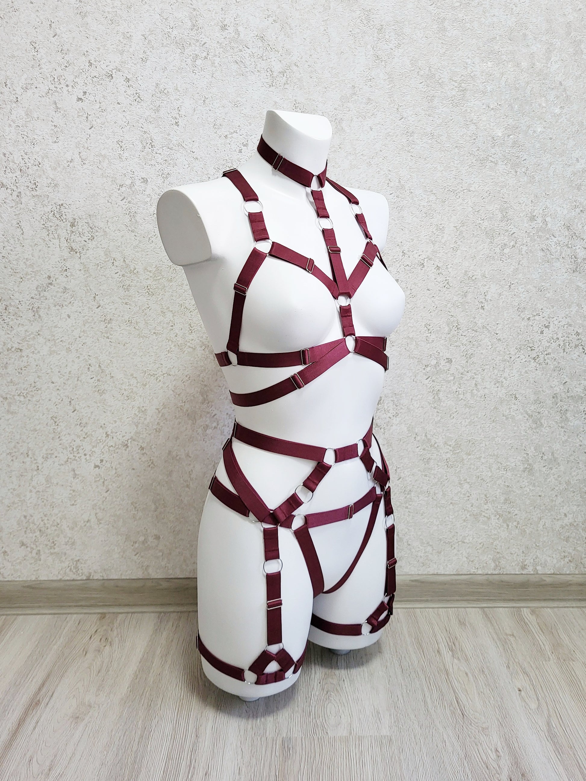 Harness set is made from elastic 2 cm width trim in burgundy color and silver metal hardware. Totally adjustable parts for maximum comort - this rave fashion harness style will rocks your look.