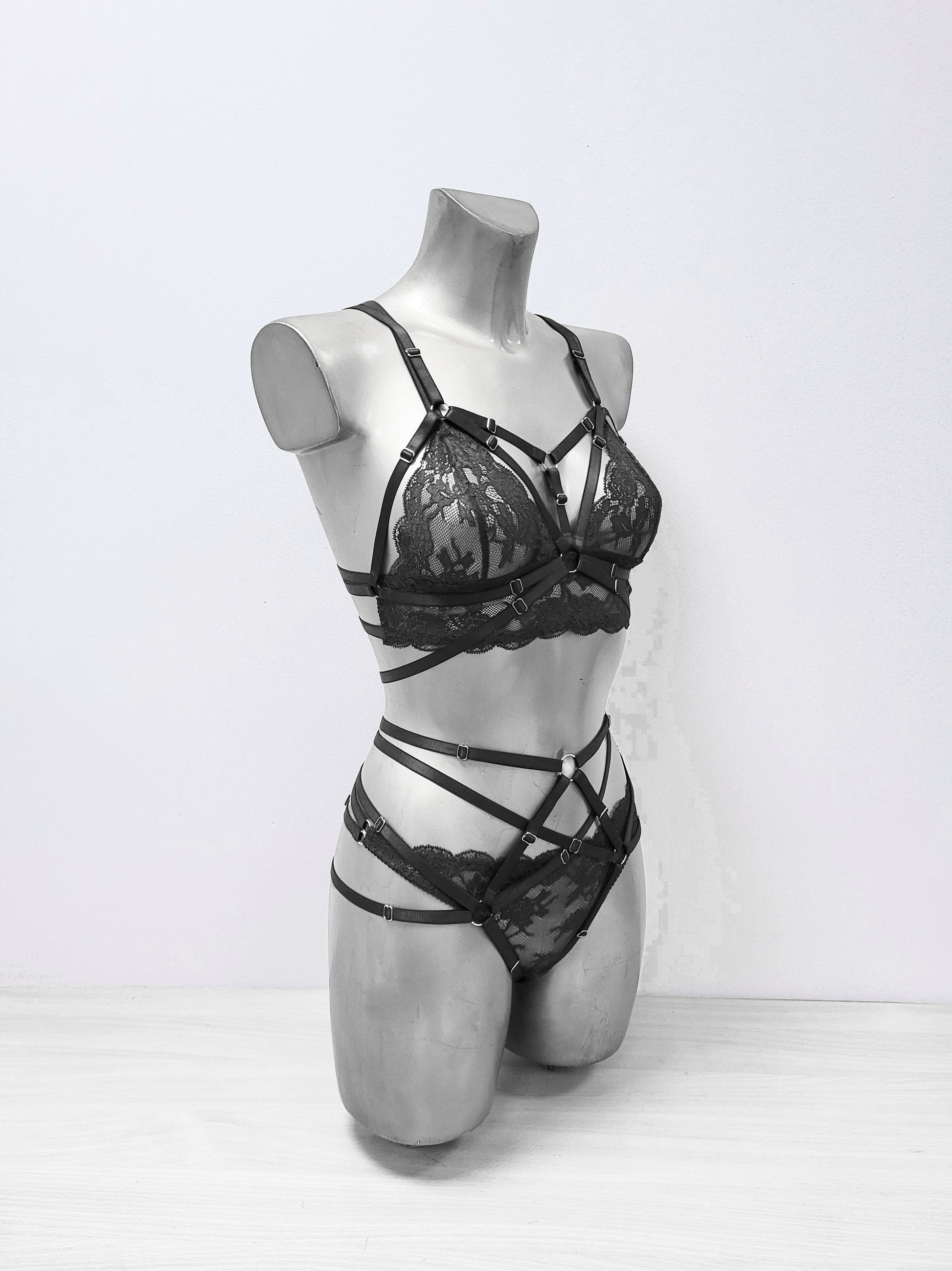 Buffy & Kitana - black lace lingerie set with harness made by Eve & Shadow.