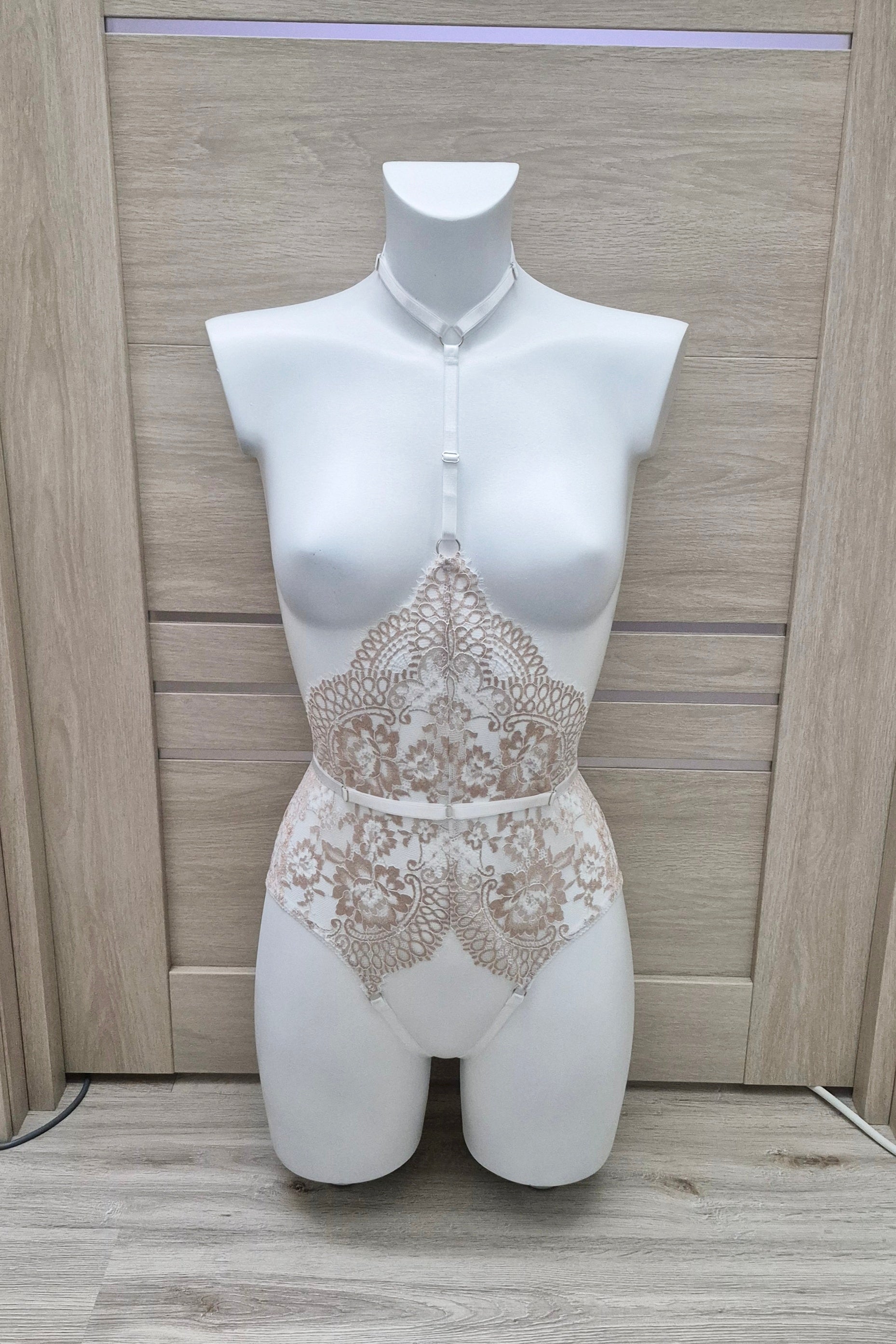 Calliope - honeymoon crotchless lace bodysuit made by Eve & Shadow.