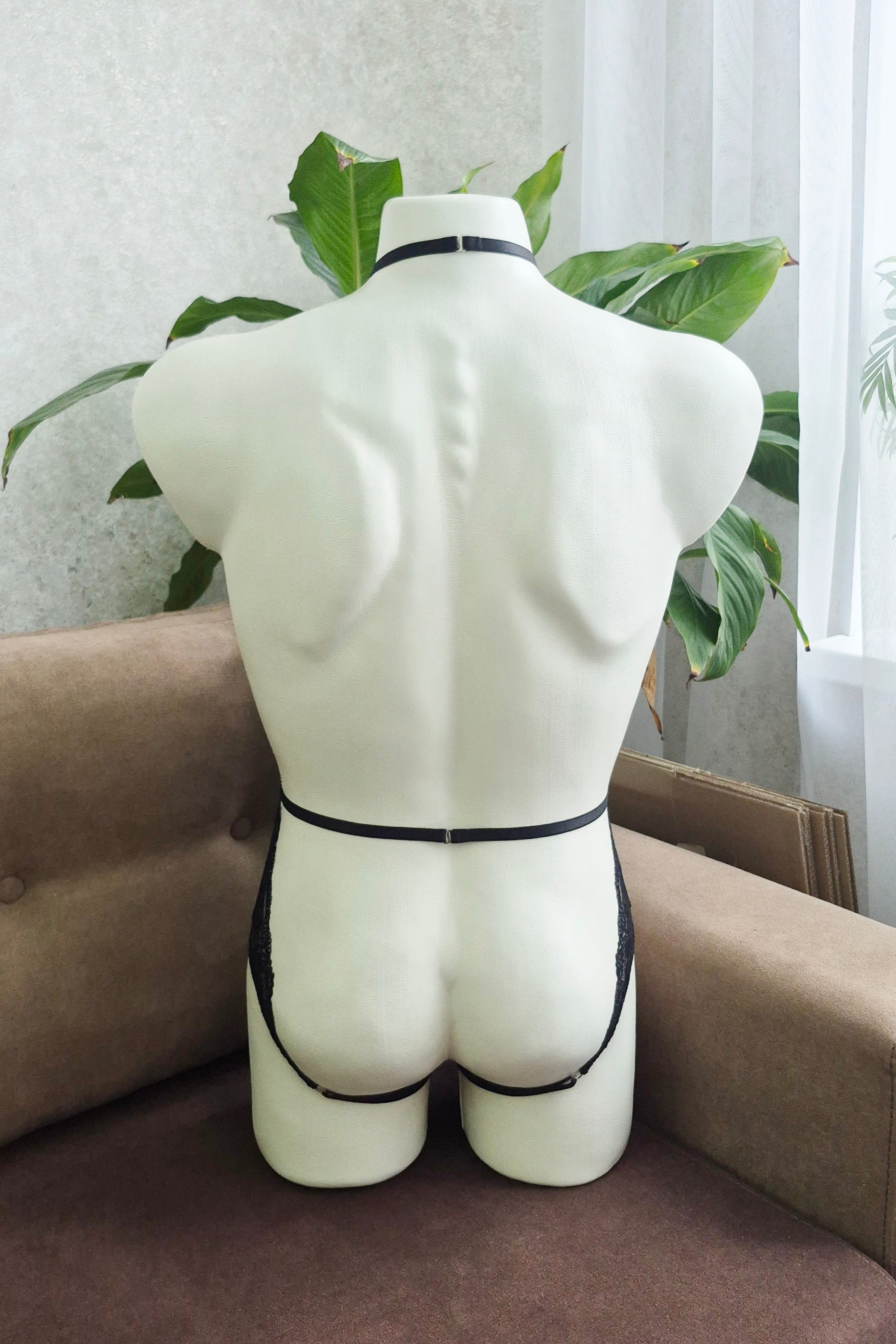 Erotic lingerie made from beautiful black lace with strappy details. Open back part for more seductive look.