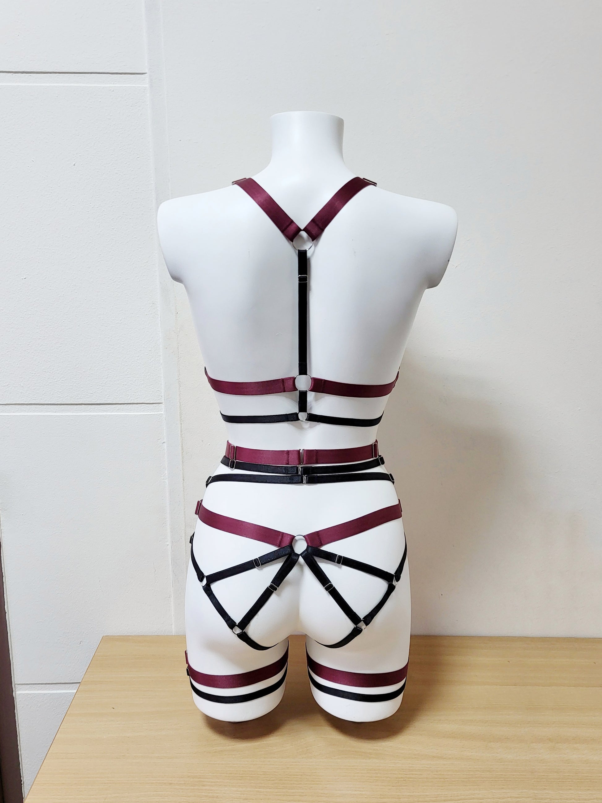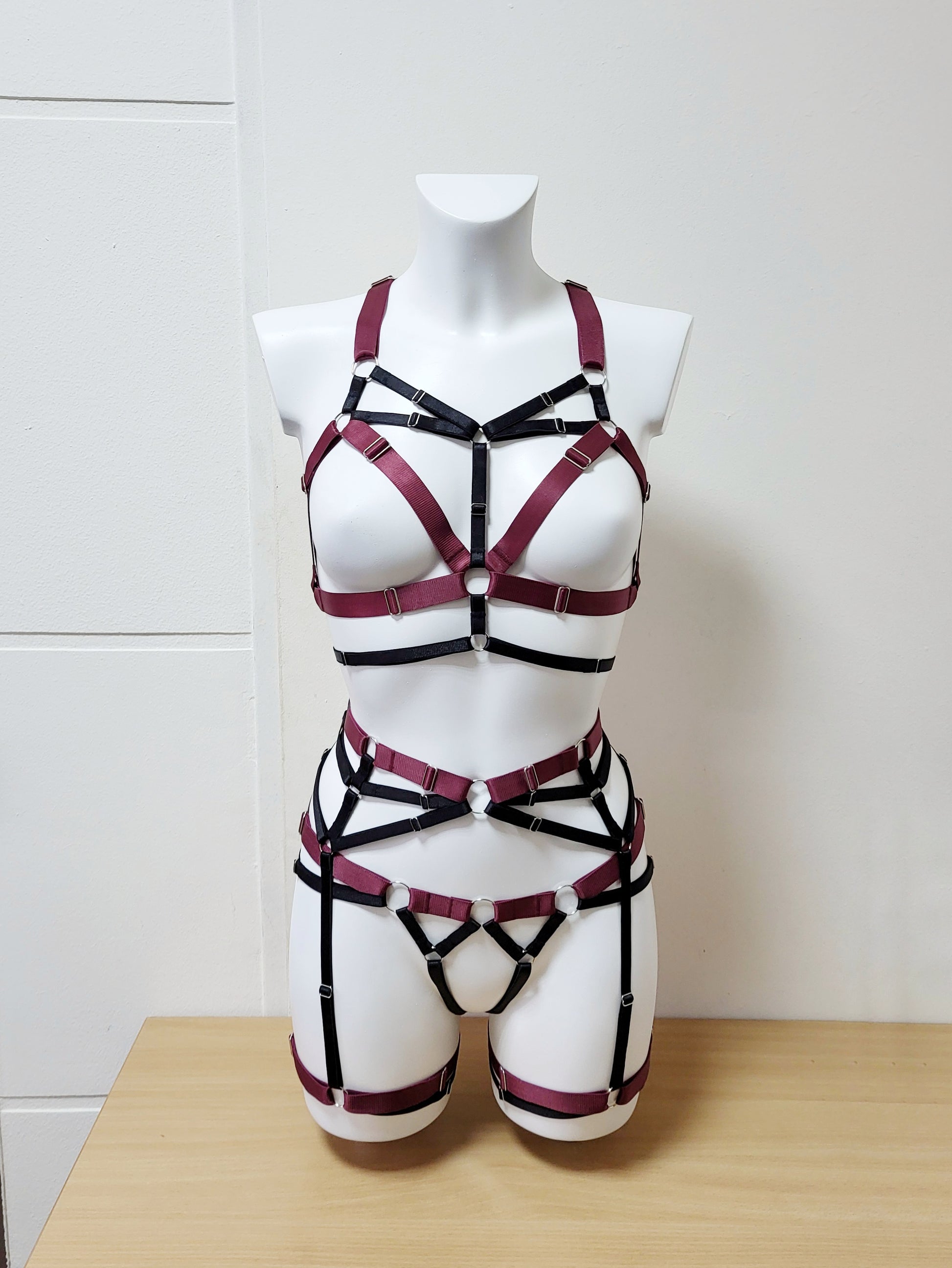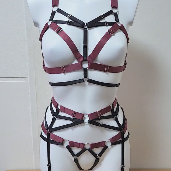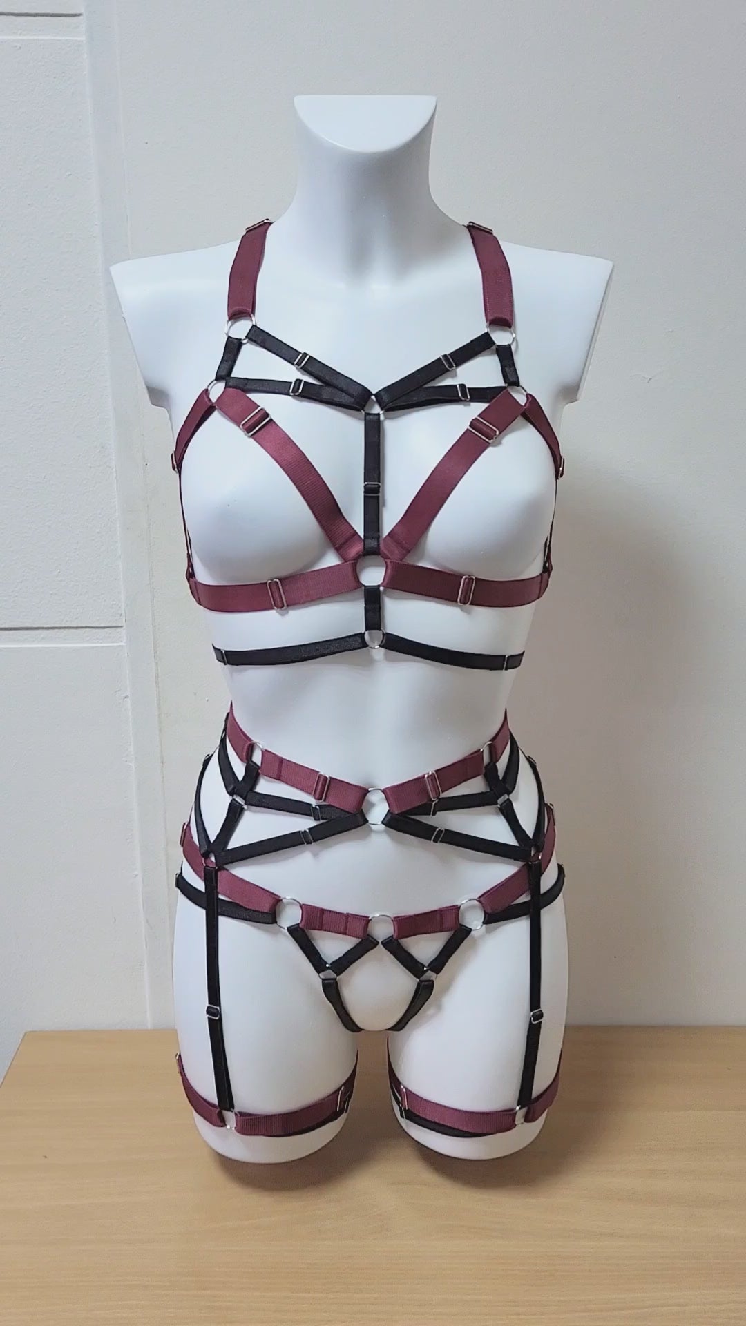 Outstanding piece with cage bra, ouvert panties and leg garter belt. All parts adjustable.