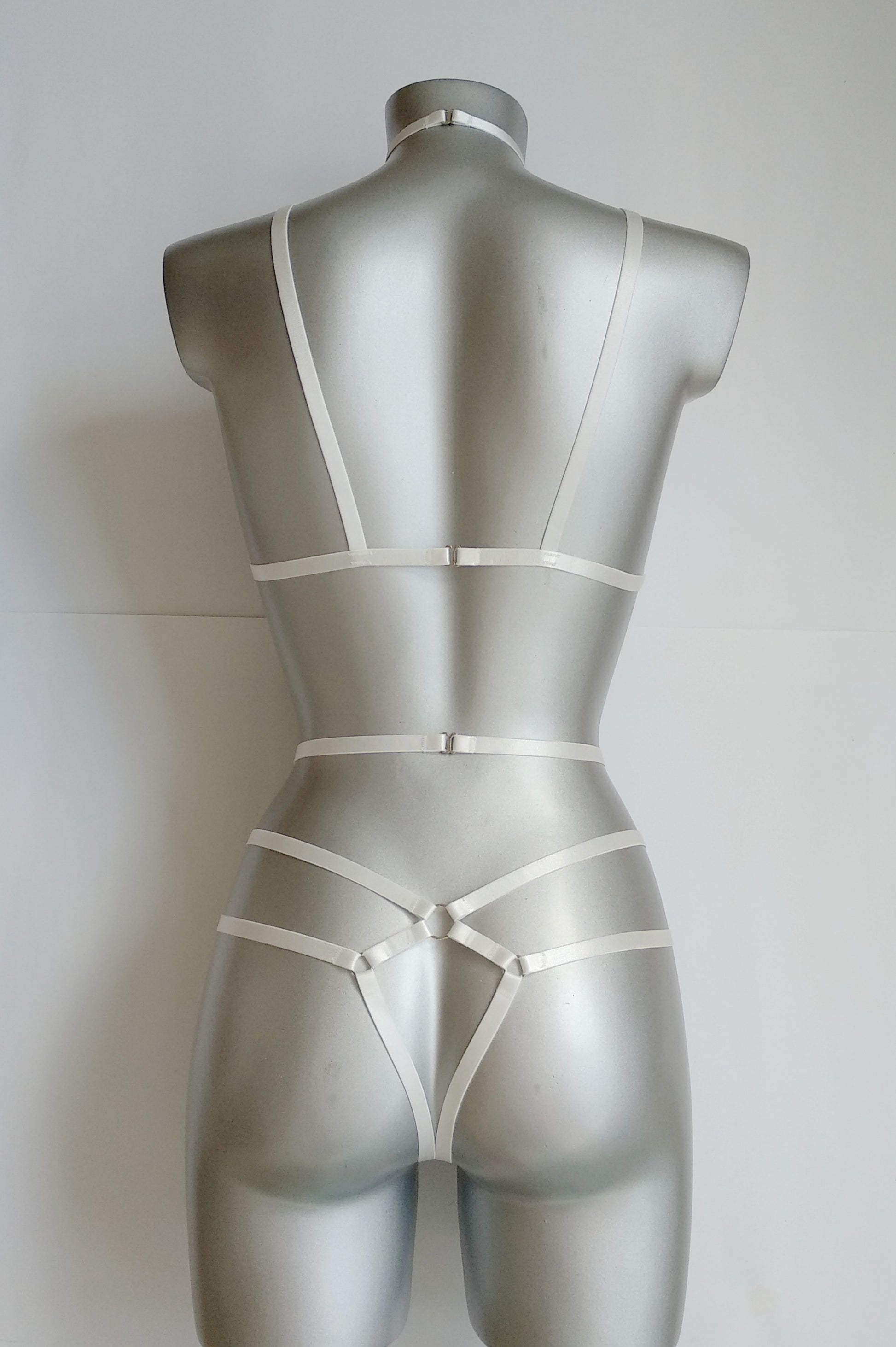 Katniss II - white women harness lingerie set made by Eve & Shadow. Gorgeous open lingerie will looks great on every body type.