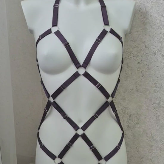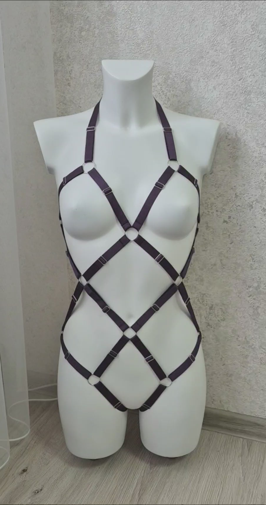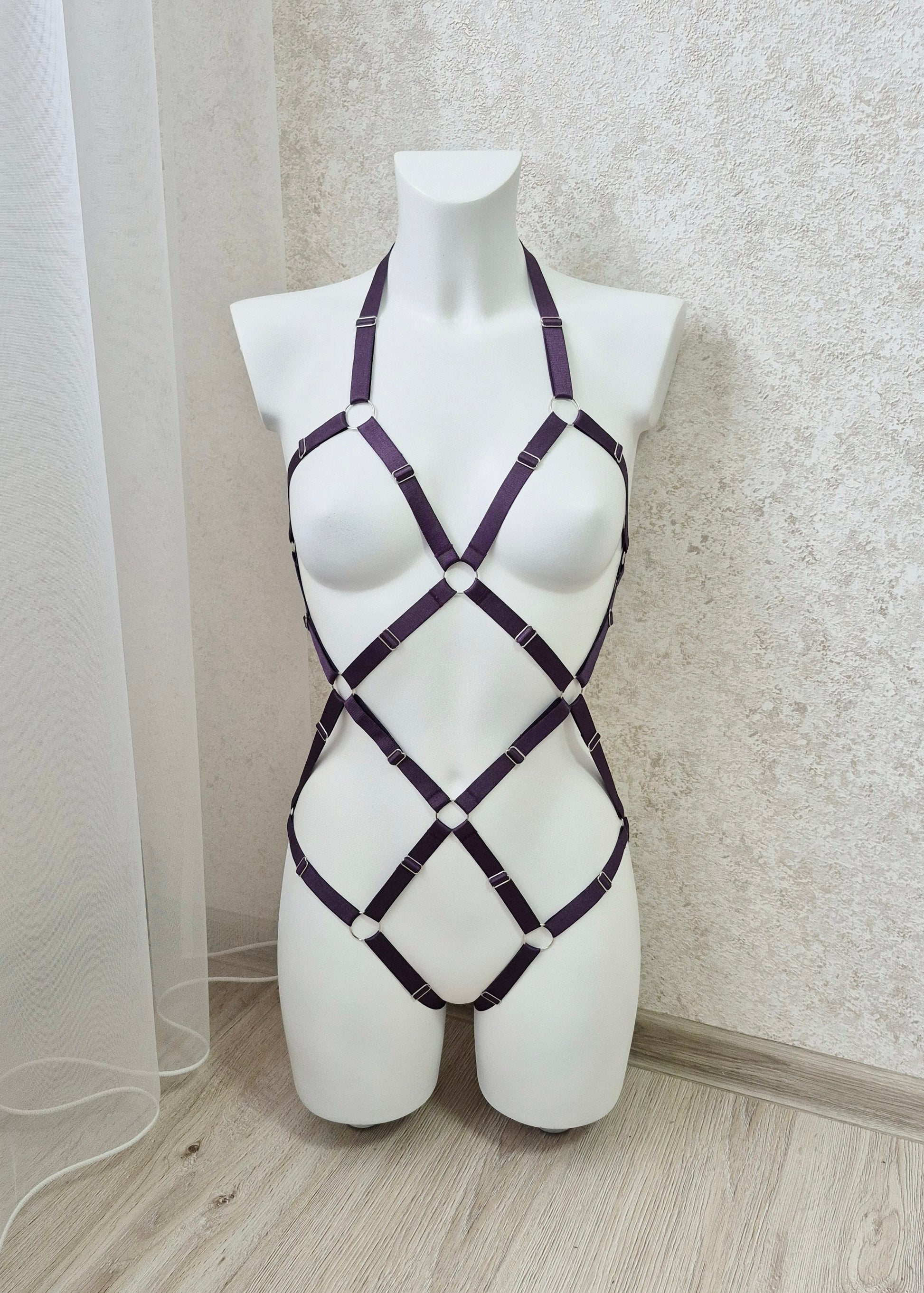 Open crotchl women bodysuit is made from elastic purple trim and metal hardware. Full body women harness perfect for festival outfit on a rave party.
