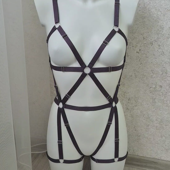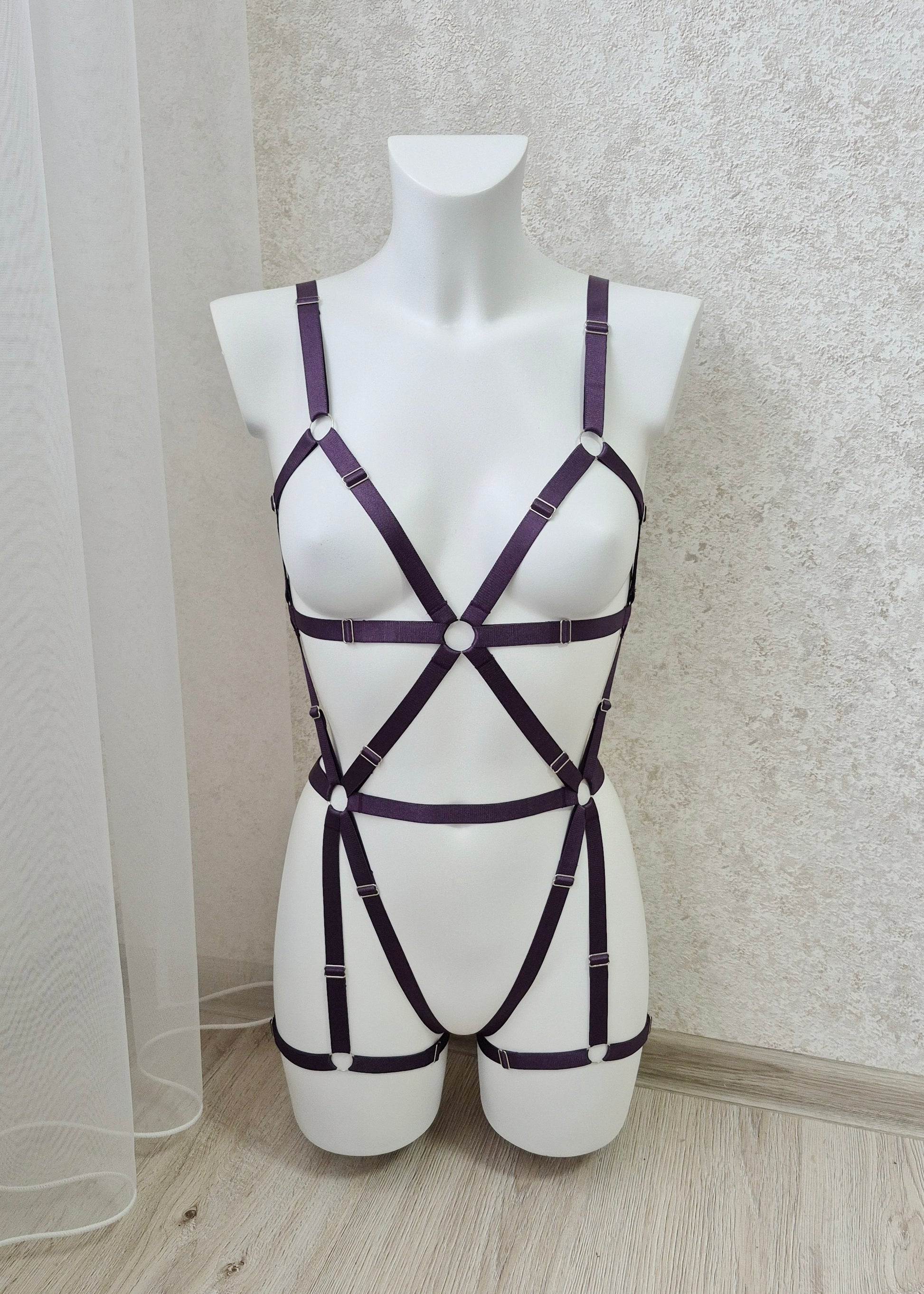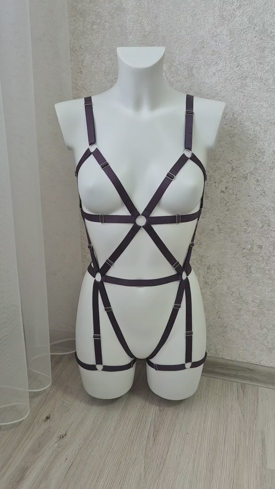 Open crotchl women bodysuit is made from elastic purple trim and metal hardware. Full body women harness perfect for honeymoon or hot night.