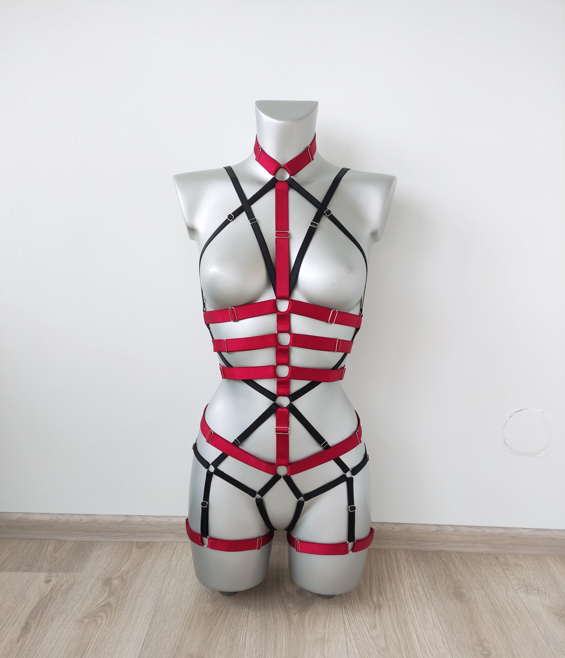 Our bestseller body harness is made from combination of two trims - wide and narrow, both elastic. Fabulous rave dance outfit.