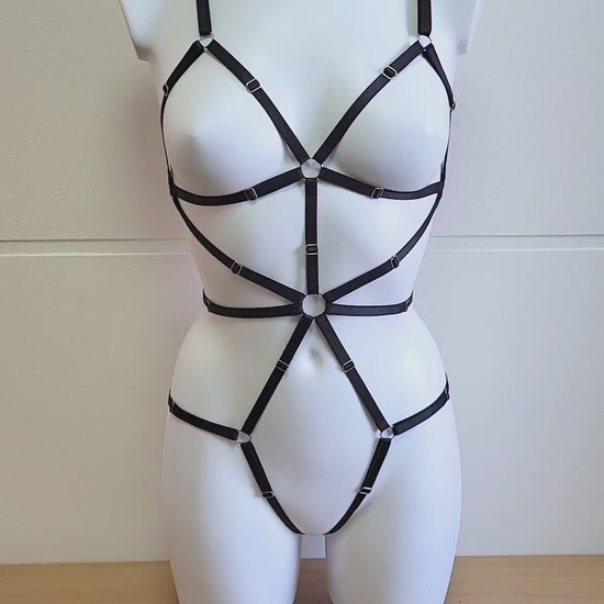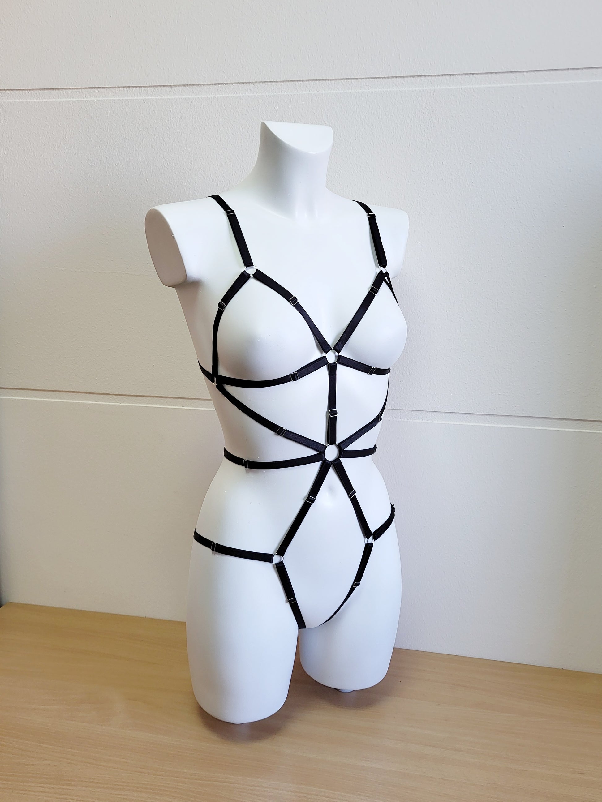 Beautiful women full body harness is made from elastic black trim and metal hardware. Great piece for kinky lingerie party or rave festival.