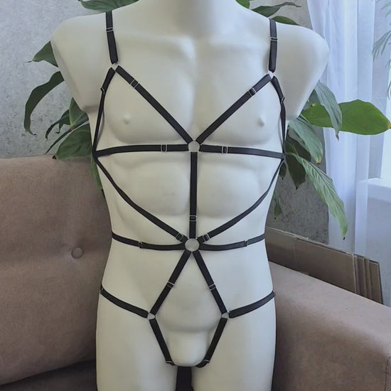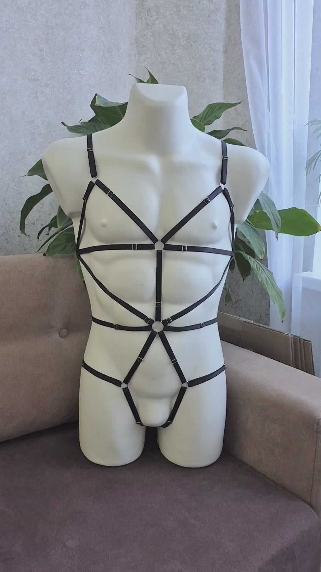 Sexy open harness bodysuit is made from elastic black trim. All parts are adjustable with sliders for best fit.