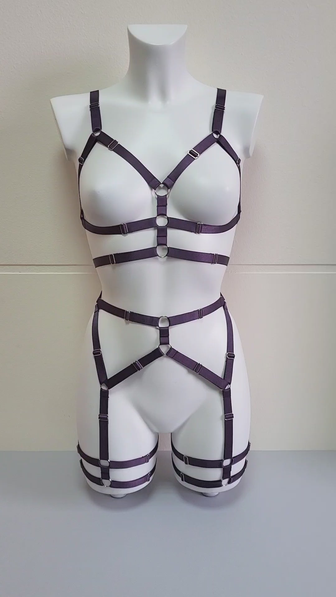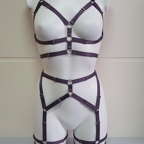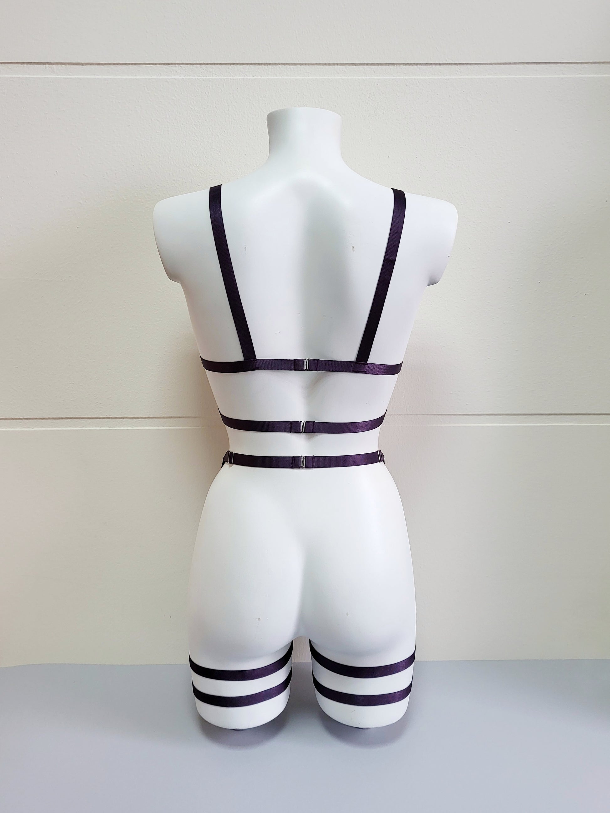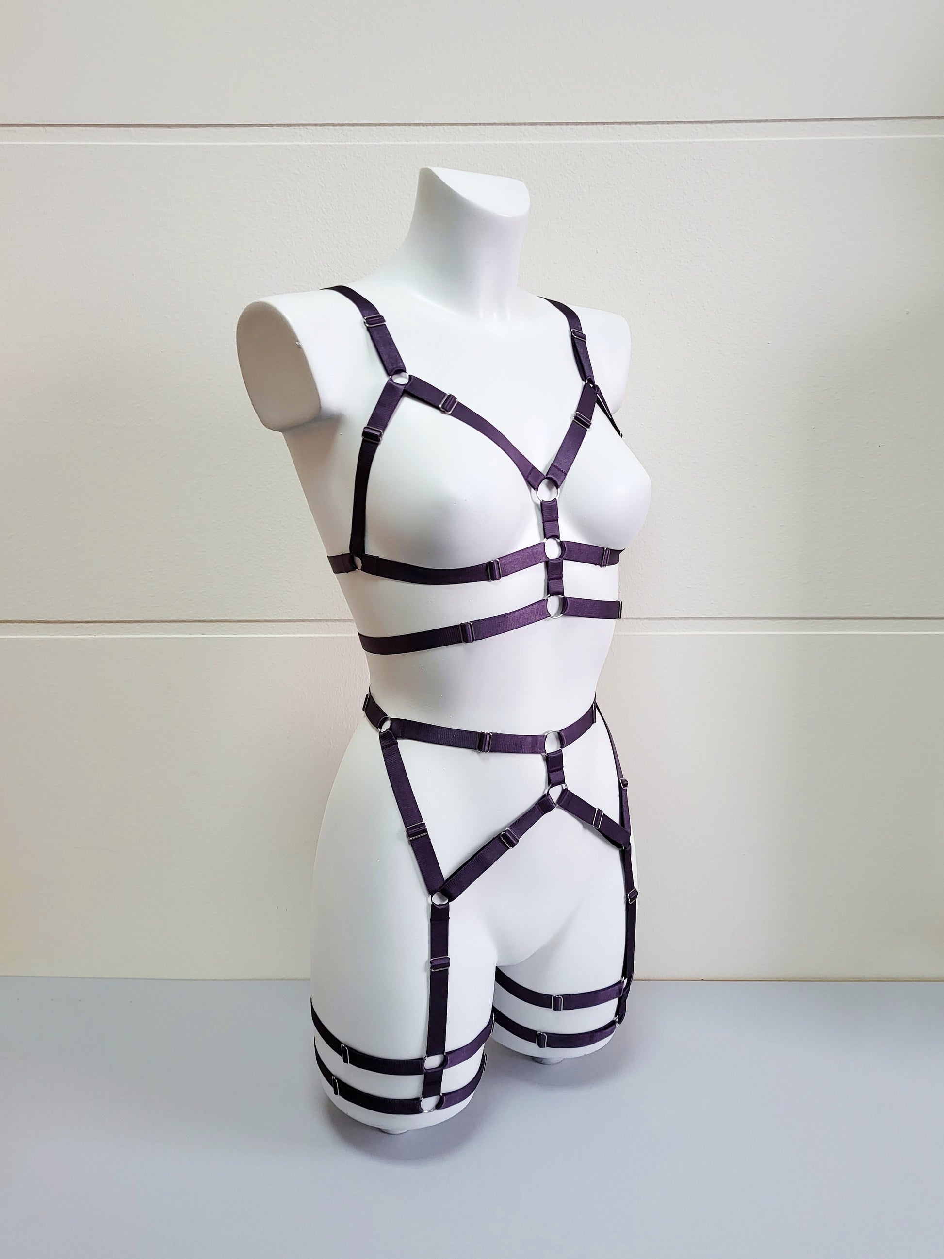Harness lingerie made from elastic purple trim and silver hardwear. Match it with your favourite lingerie set to create special seductive look.